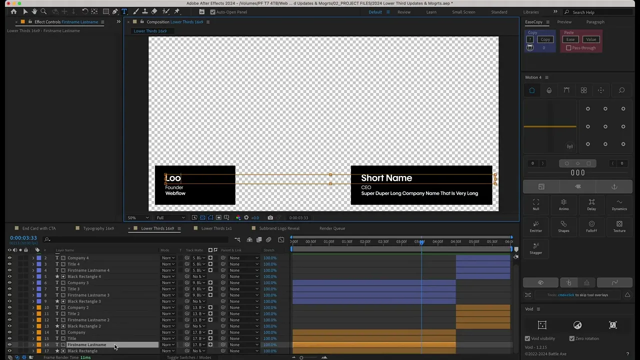 This first mogrt was a set of customizable lower thirds. I built them to resized based on the length of the name, title, or company, and they also had a double lower third option in case two people were being introduced together.