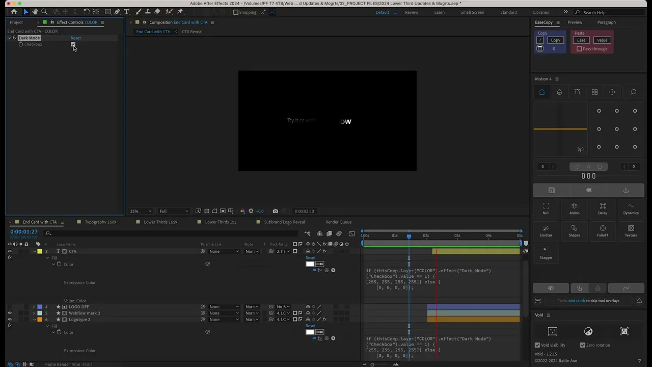 I created a set of fully responsive motion graphics templates (mogrts) for Webflow's team to use in their video content. I worked in After Effects and JavaScript to build lower thirds and end cards that can be customized directly inside of Premiere Pro by other editors at Webflow.
